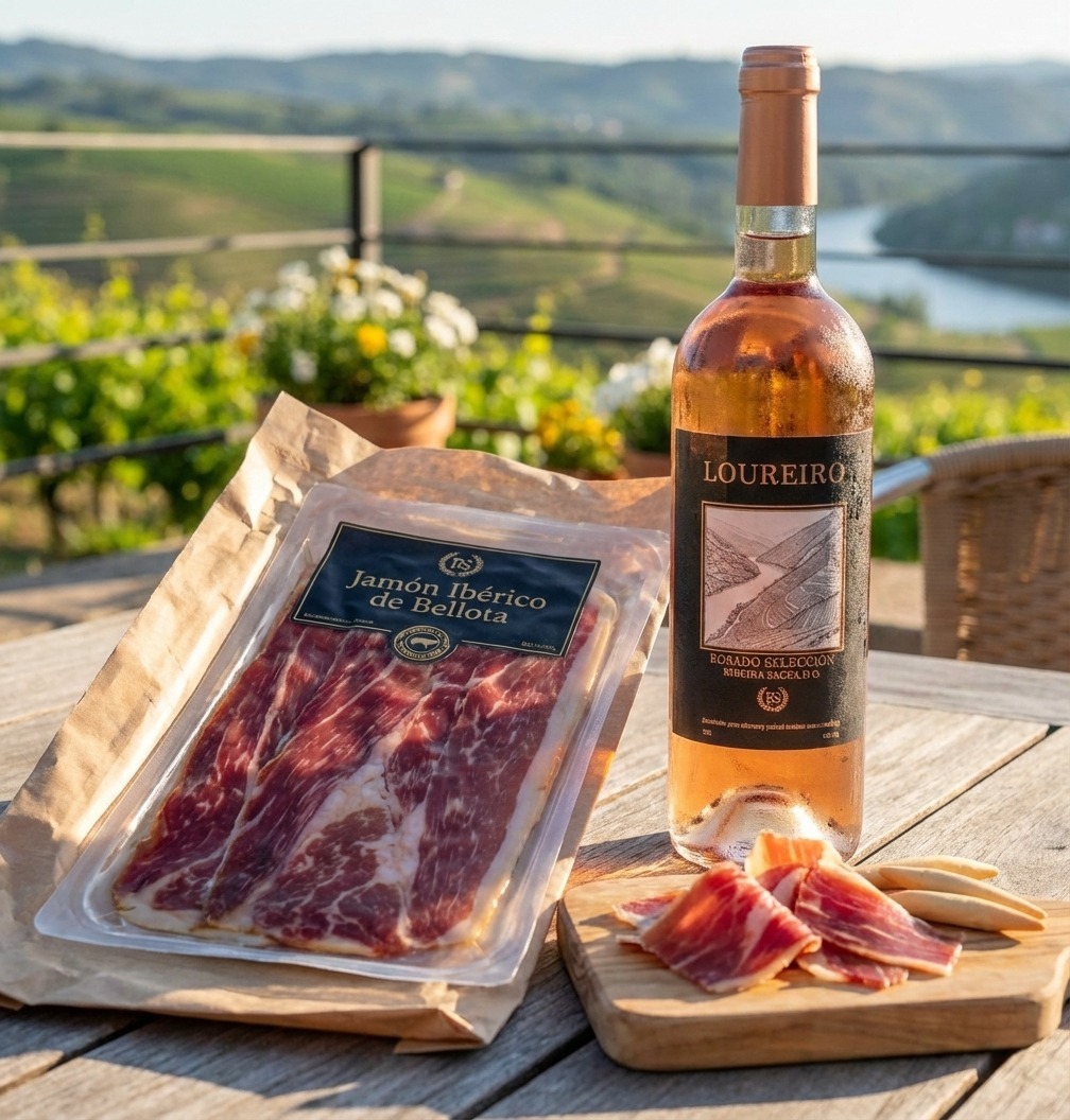 La máxima expresión del placer artesano. Disfruta de la frescura y los matices frutales de nuestro Loureiro Rosado en perfecta armonía con el sabor intenso y la textura fundente del mejor jamón de bellota (precio pata: 170 euros). Un corte seleccionado de piezas cuya calidad está avalada por la tradición, creando un maridaje donde la salinidad del ibérico y la elegancia del vino se elevan mutuamente. El lujo de la sencillez, servido para compartir.