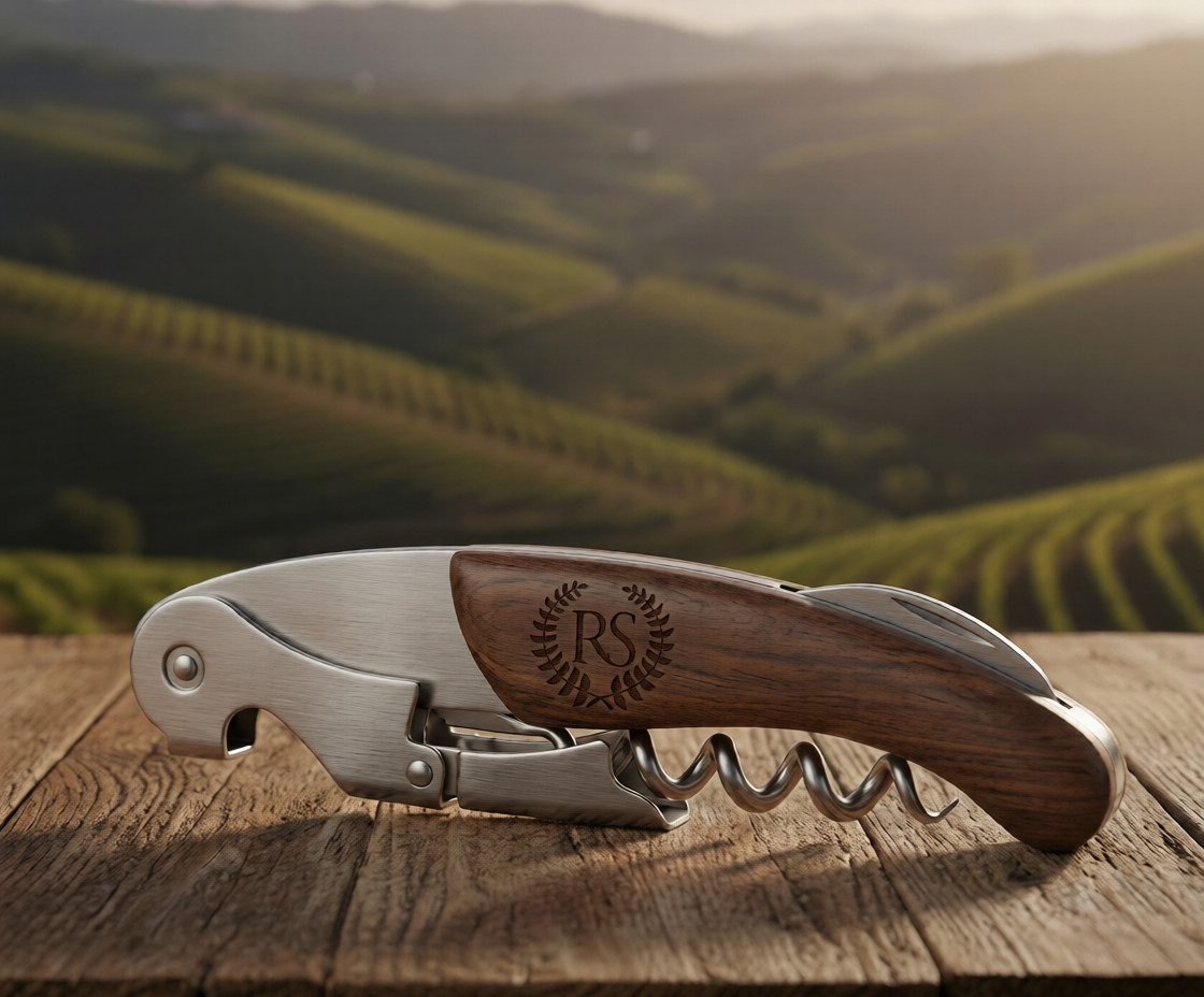 Abre tus vinos con la misma elegancia con la que fueron creados. Sacacorchos de dos tiempos profesional con cuerpo de acero inoxidable y mango de madera natural grabado con nuestro emblema. Robusto, preciso y eterno.